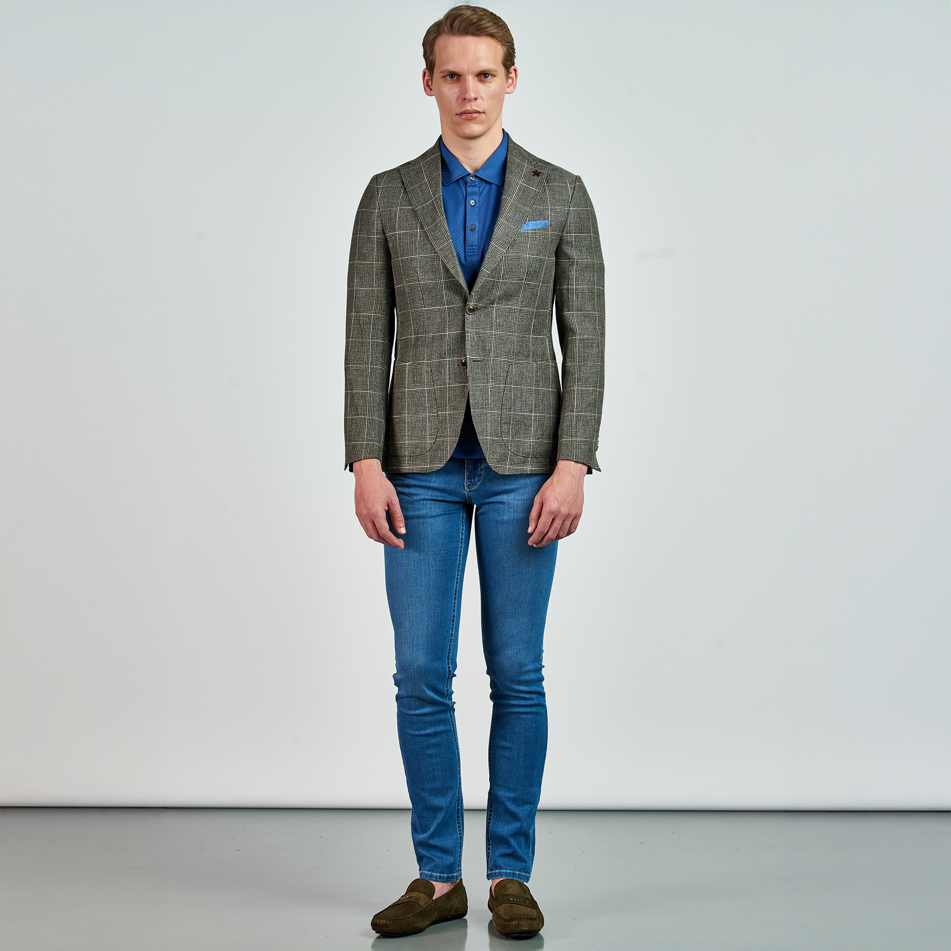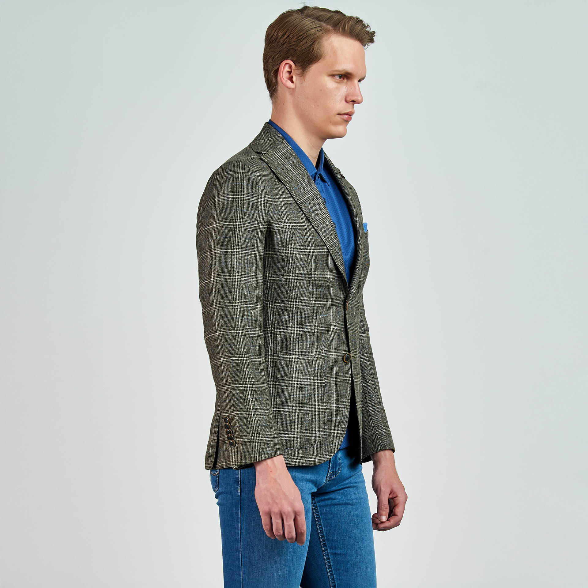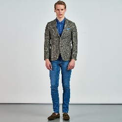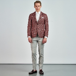 Düz renk, dokulu, kareli Ceket. Mono yaka, punto dikişli, düğme kapatmalı, çift yırtmaçlı, 3 adet dış cepli, 3 adet iç cepli.