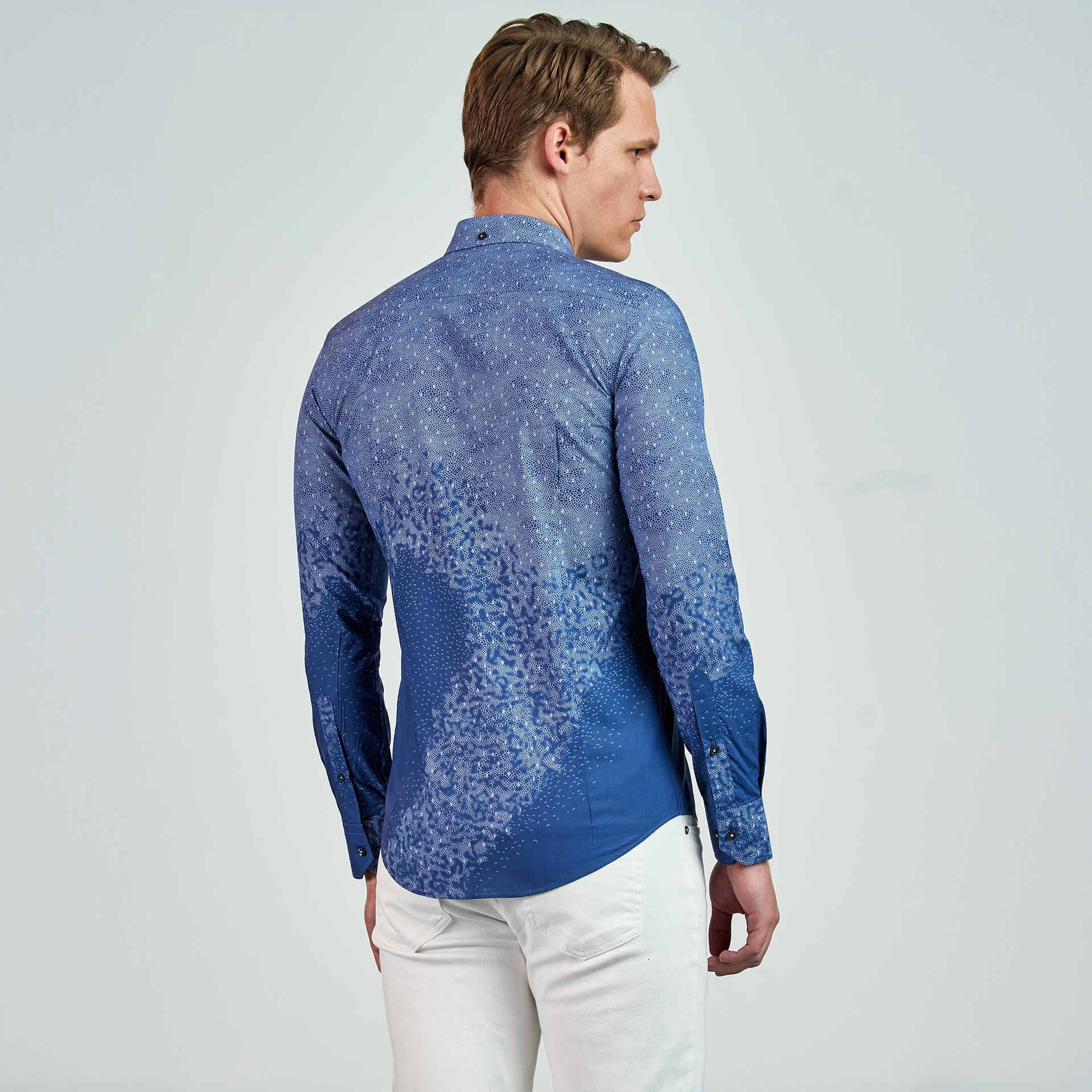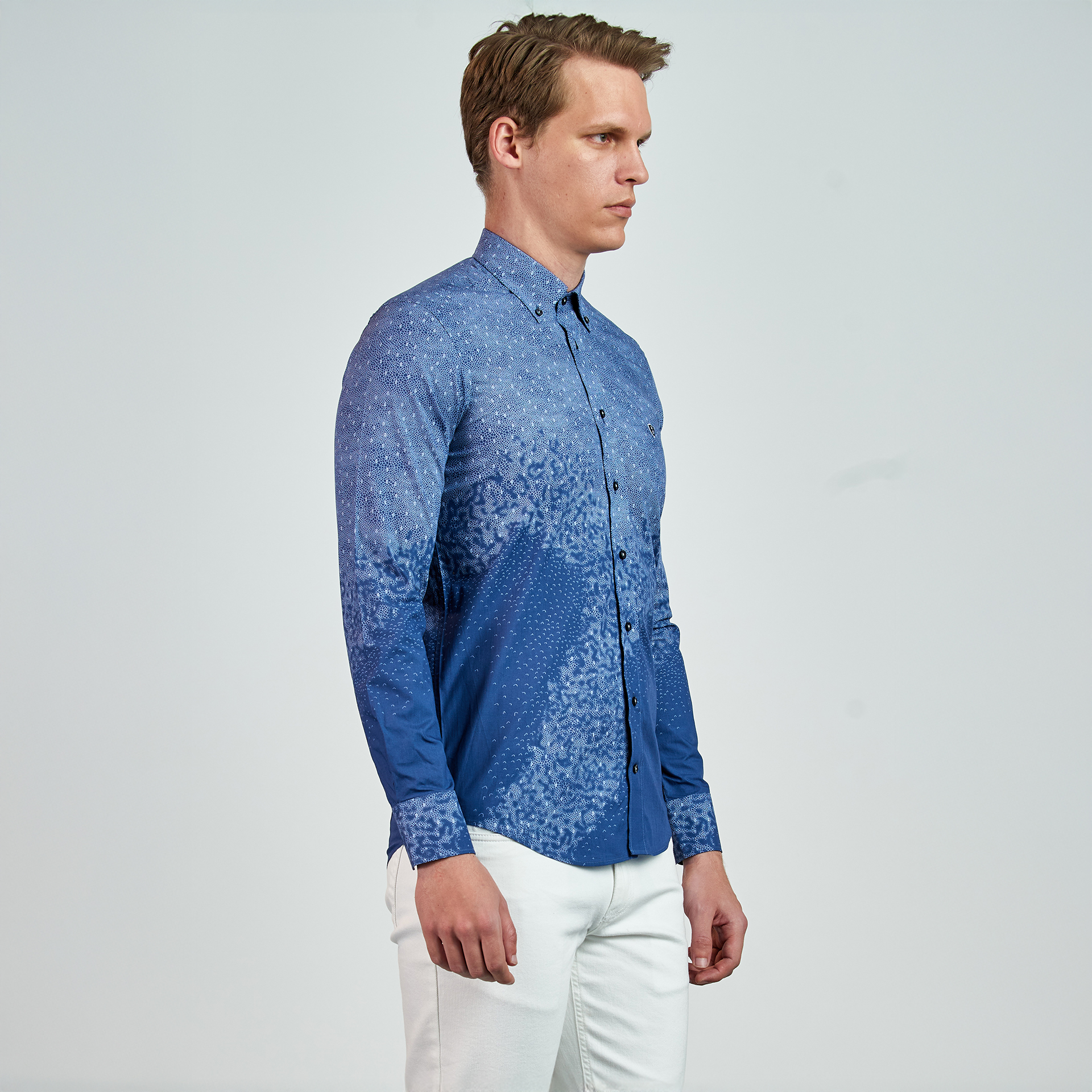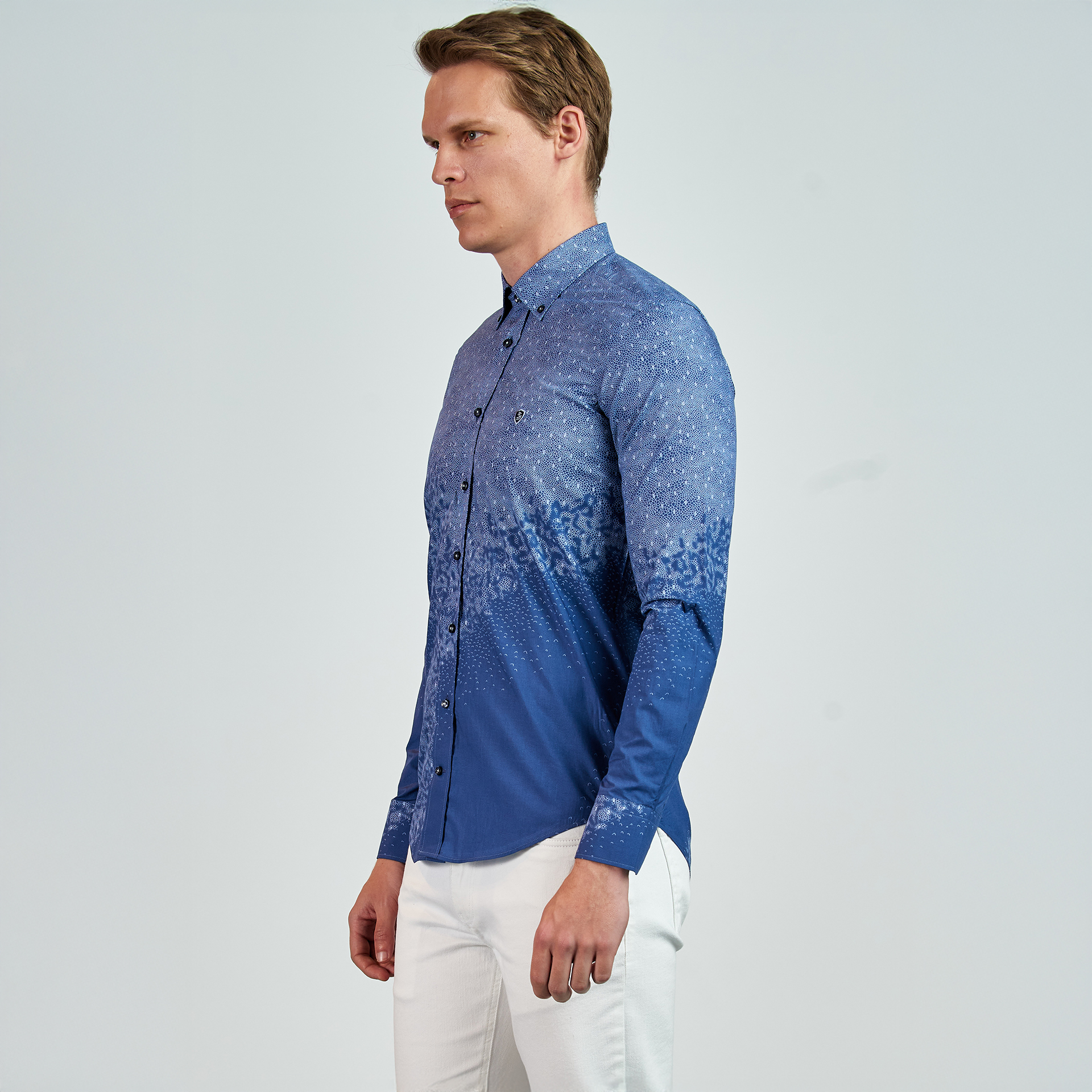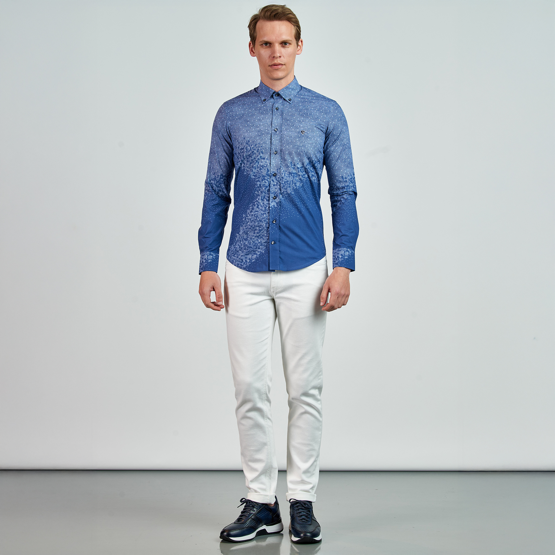 Düğmeli yaka, düğme kapatmalı, desen baskılı, logo nakış detaylı, Gömlek