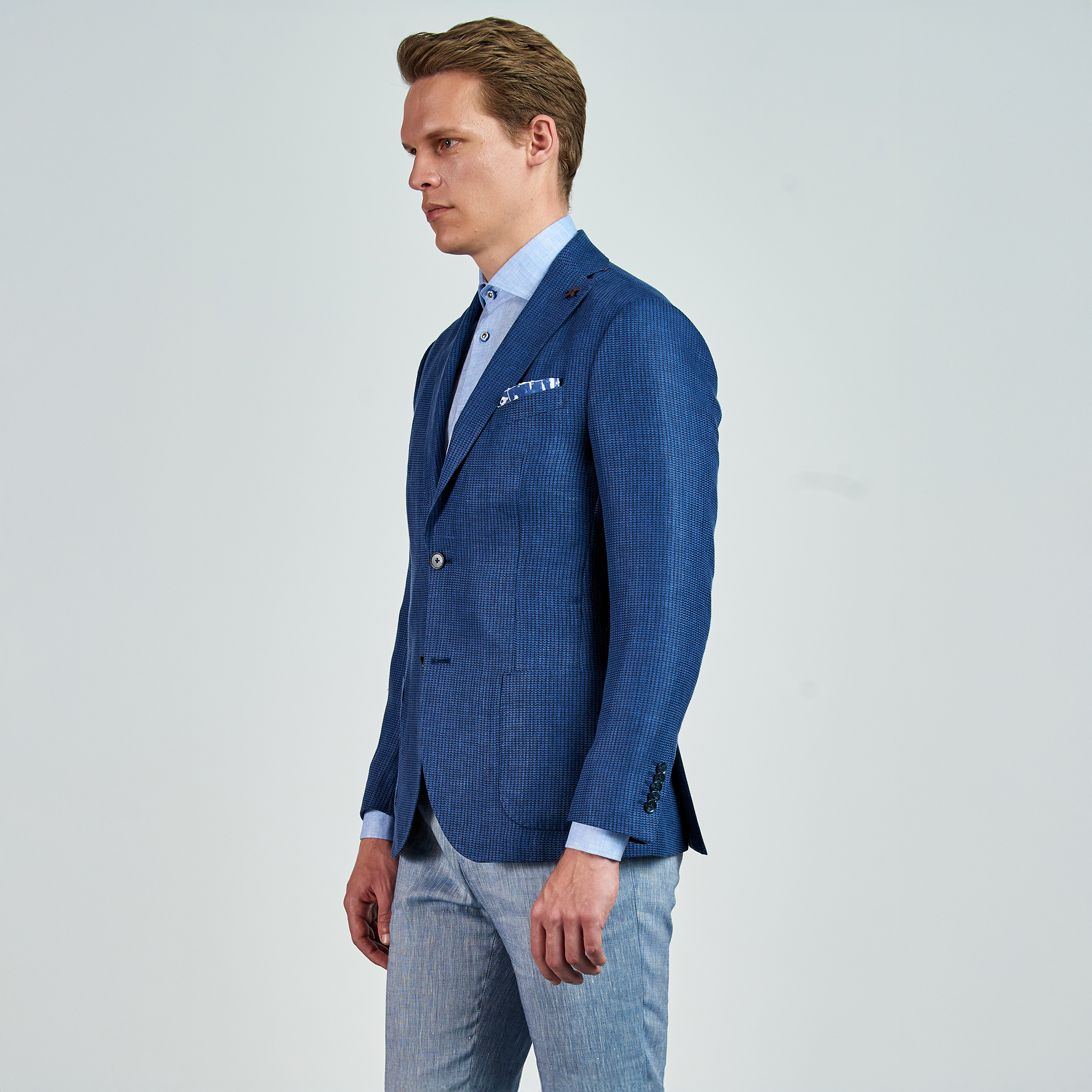 Düz renk, çizgi dokulu Ceket. Mono yaka, punto dikişli, düğme kapatmalı, çift yırtmaçlı, 3 adet dış cepli, 3 adet iç cepli.