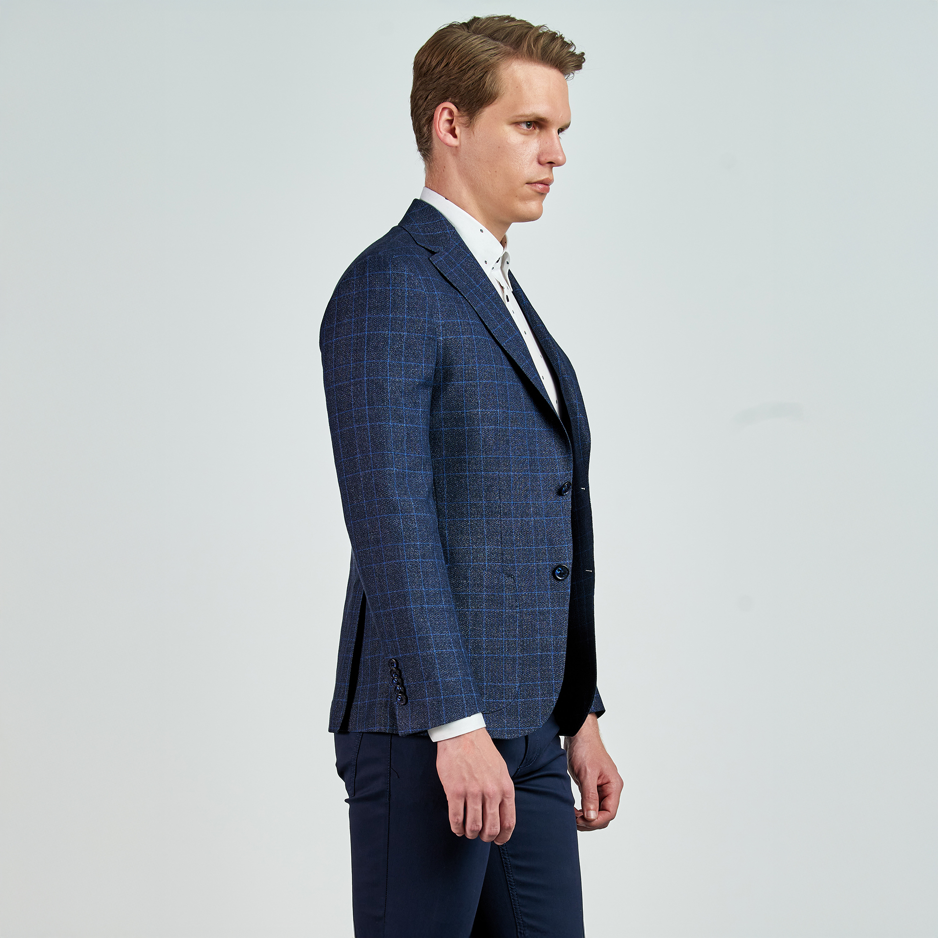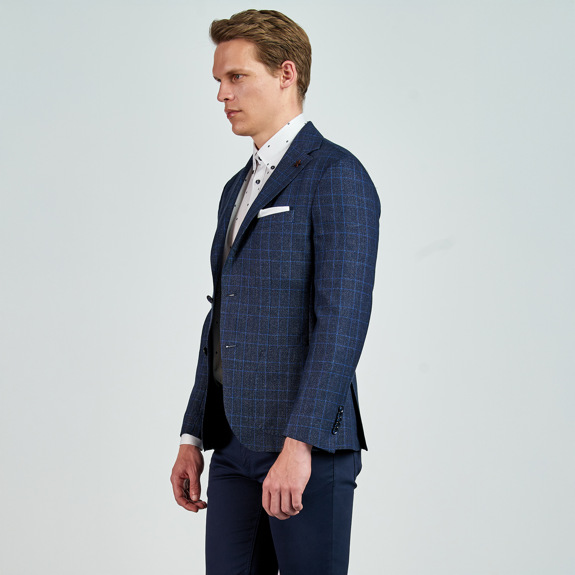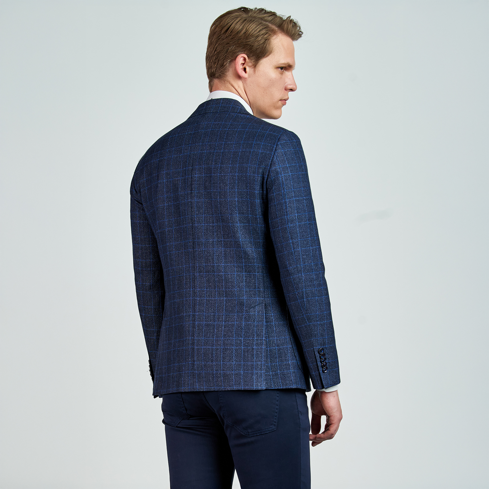 Düz renk, dokulu, kareli Ceket. Mono yaka, punto dikişli, düğme kapatmalı, çift yırtmaçlı, 3 adet dış cepli, 3 adet iç cepli.