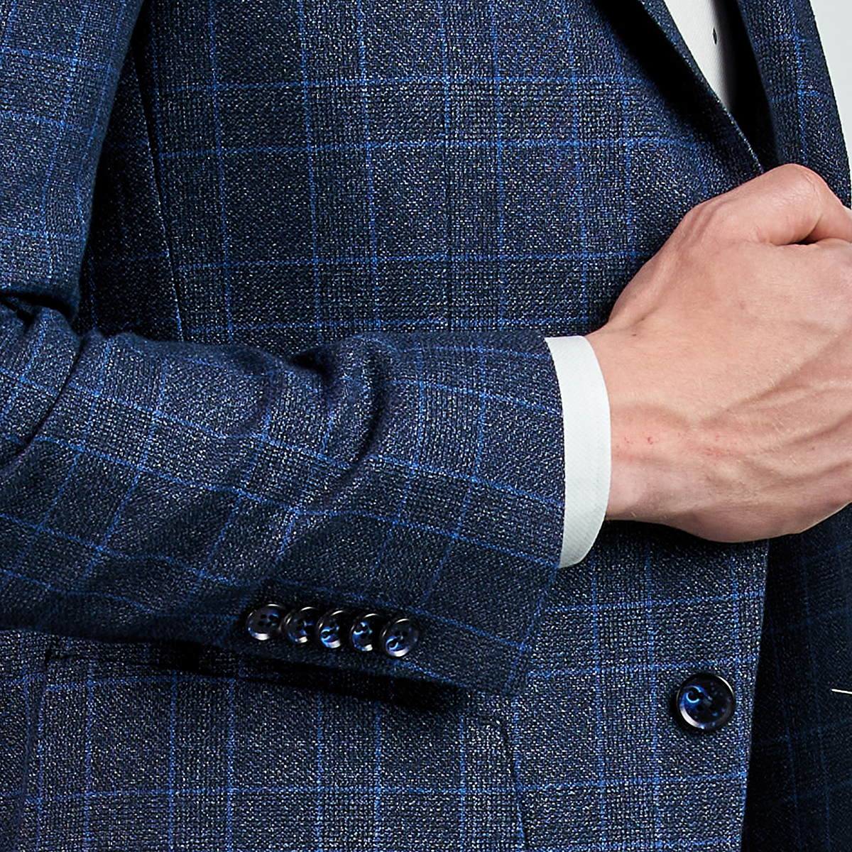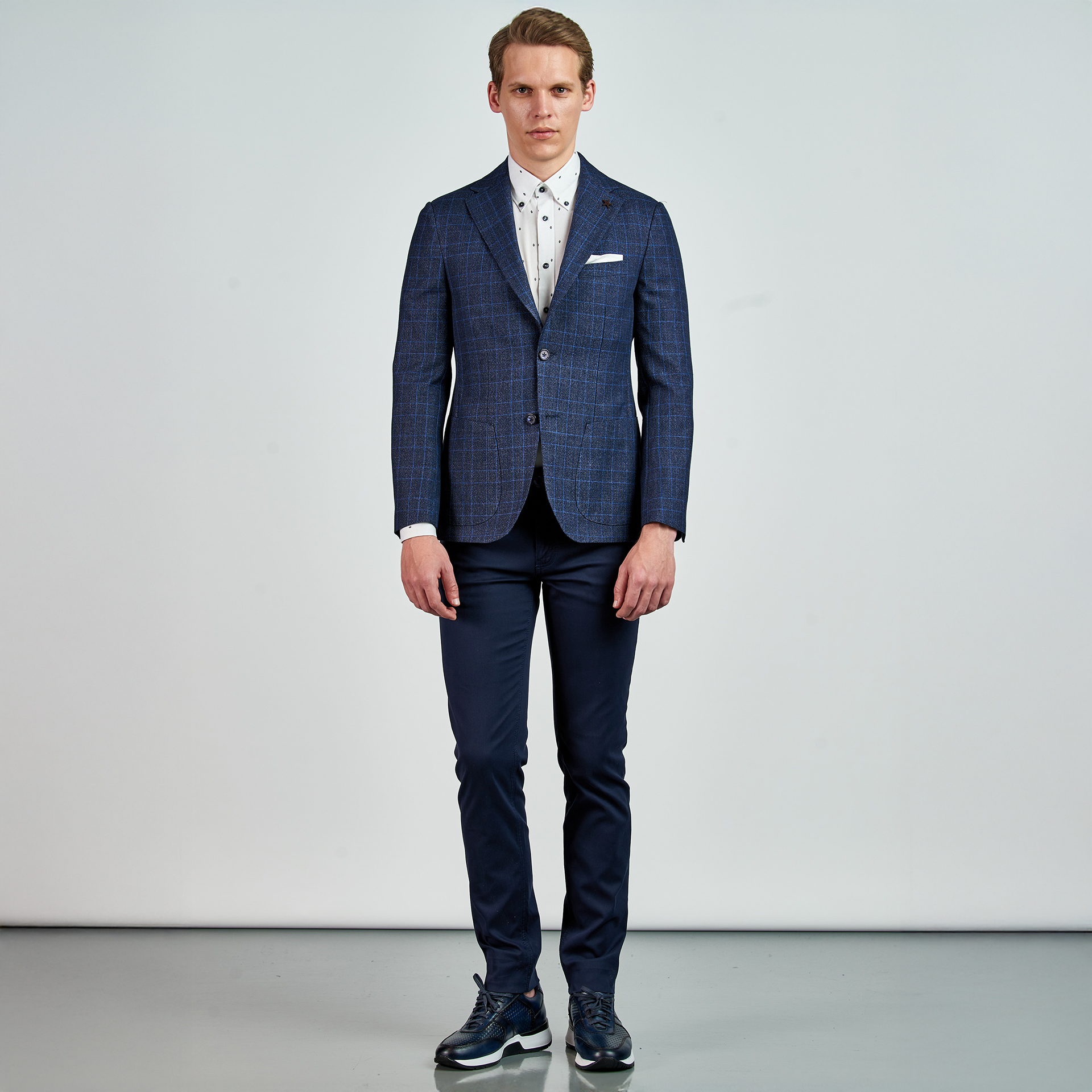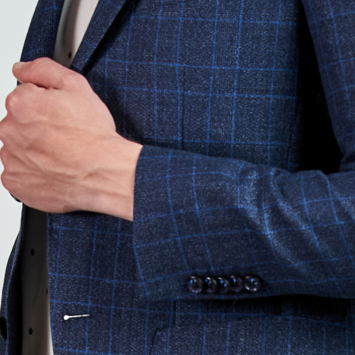 Düz renk, dokulu, kareli Ceket. Mono yaka, punto dikişli, düğme kapatmalı, çift yırtmaçlı, 3 adet dış cepli, 3 adet iç cepli.
