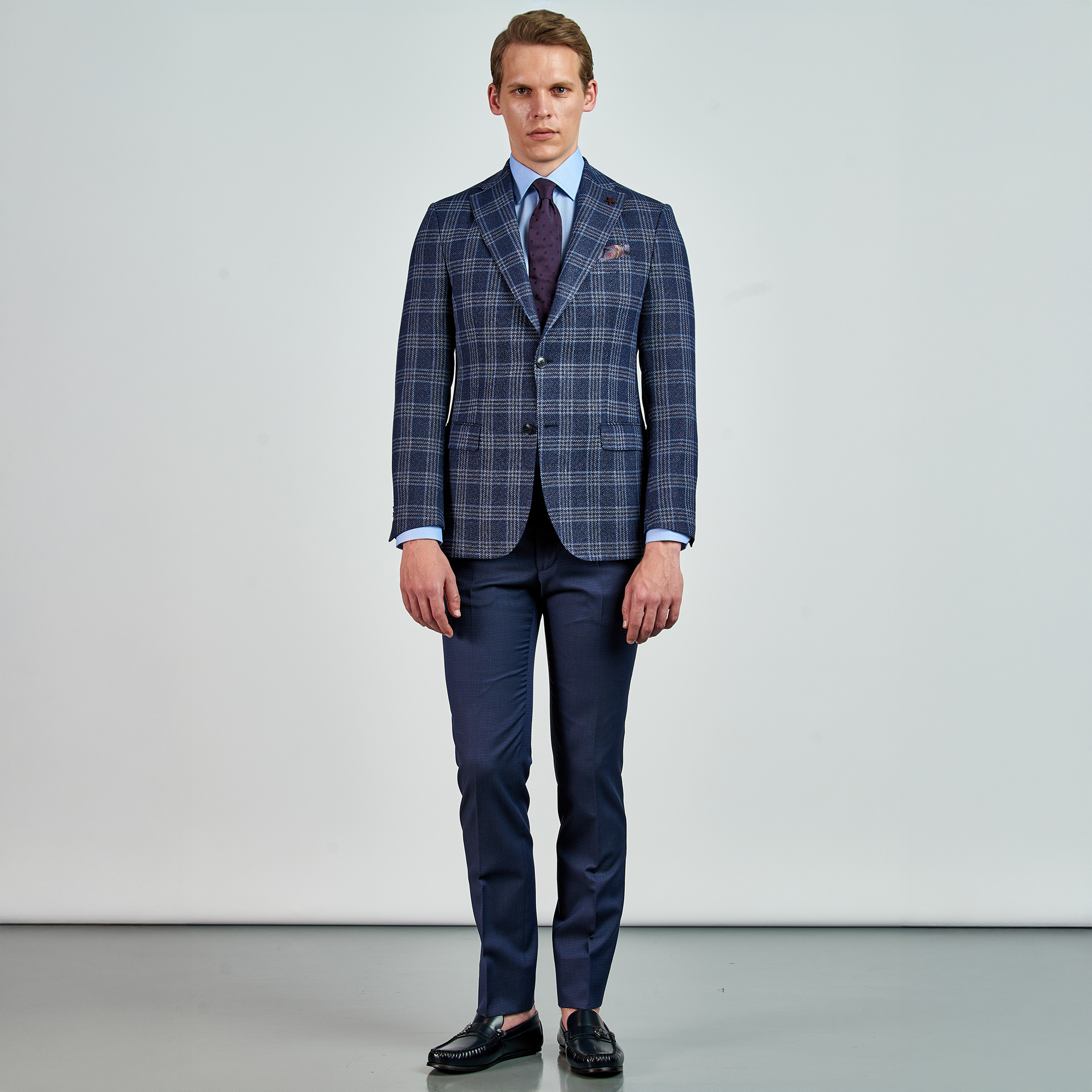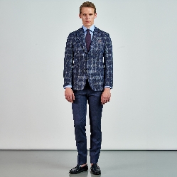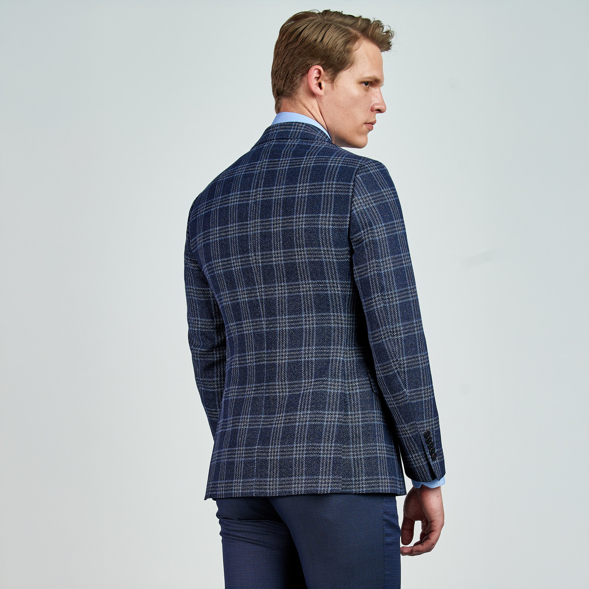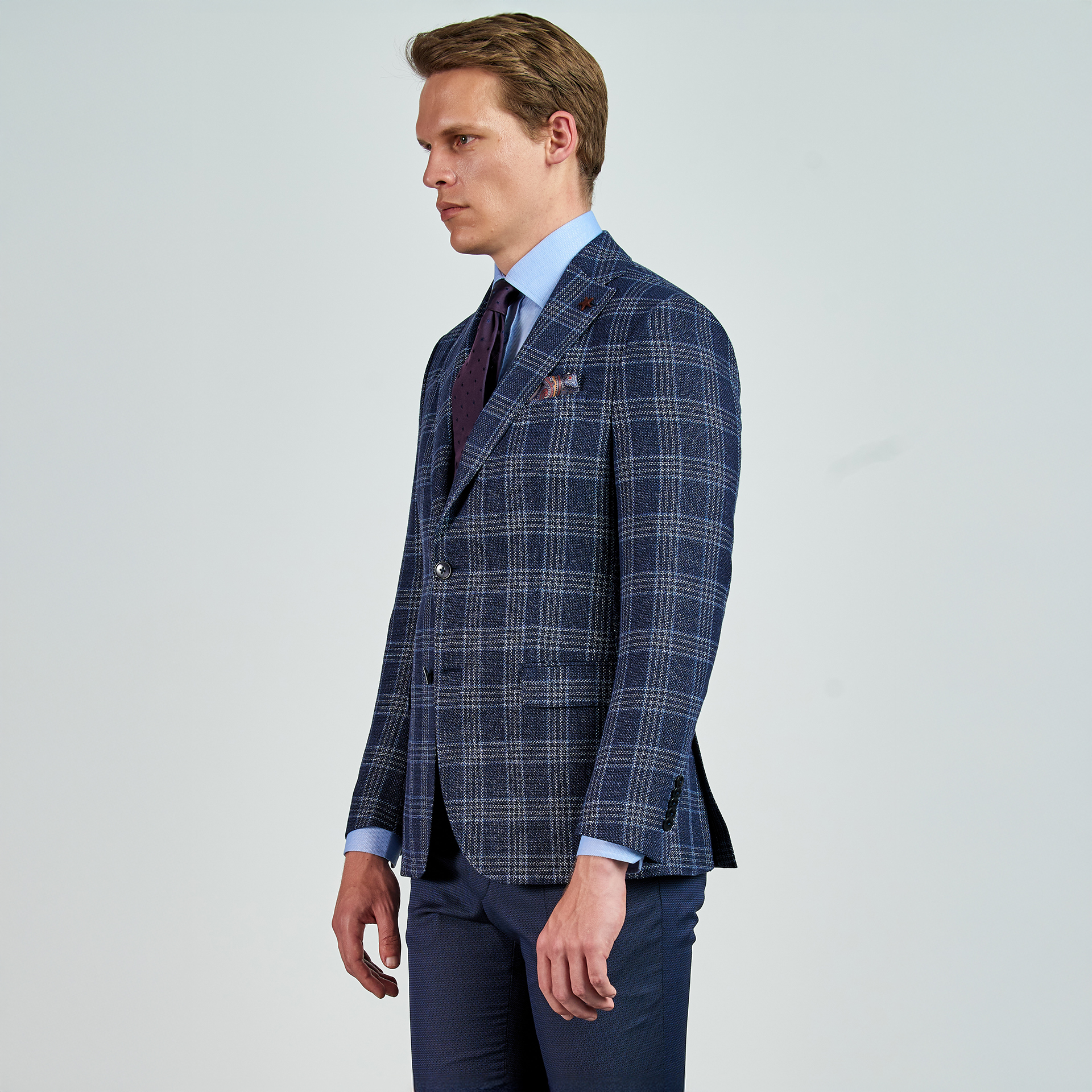 Ekose desenli,dokulu Ceket. Mono yaka, punto dikişli, düğme kapatmalı, çift yırtmaçlı, 3 adet dış cepli, 3 adet iç cepli.