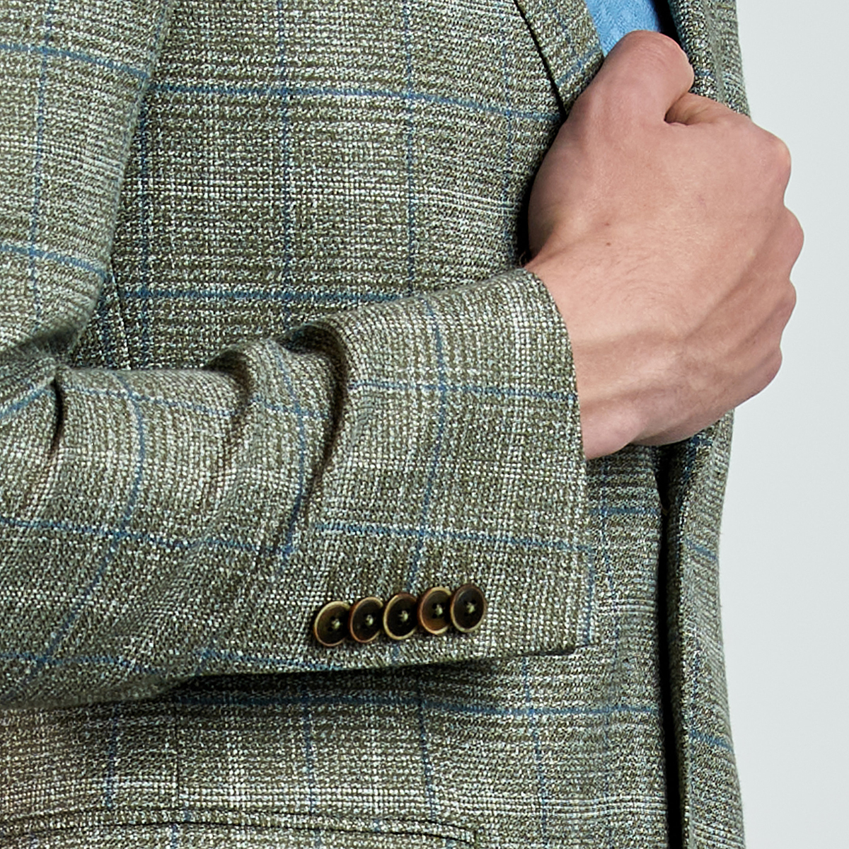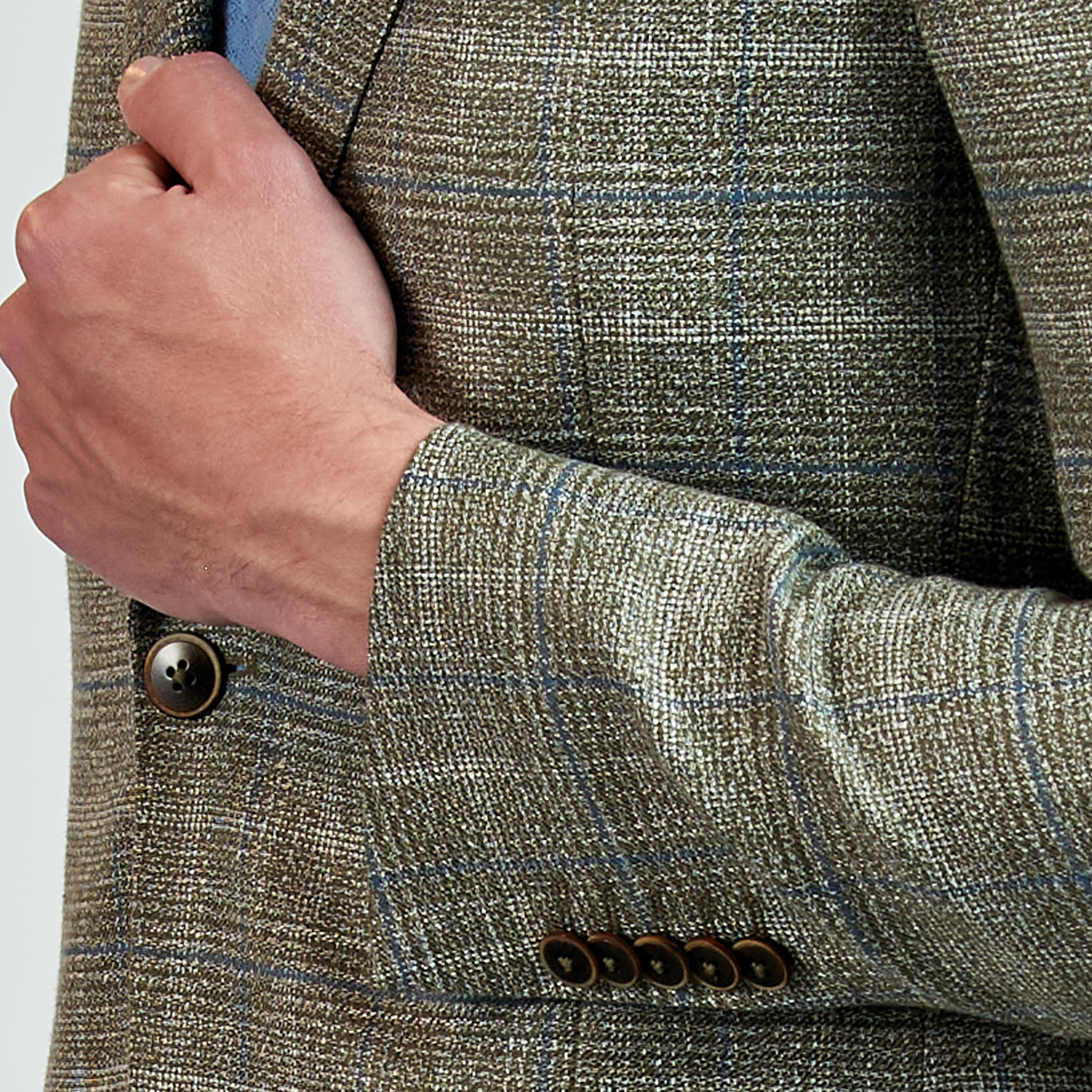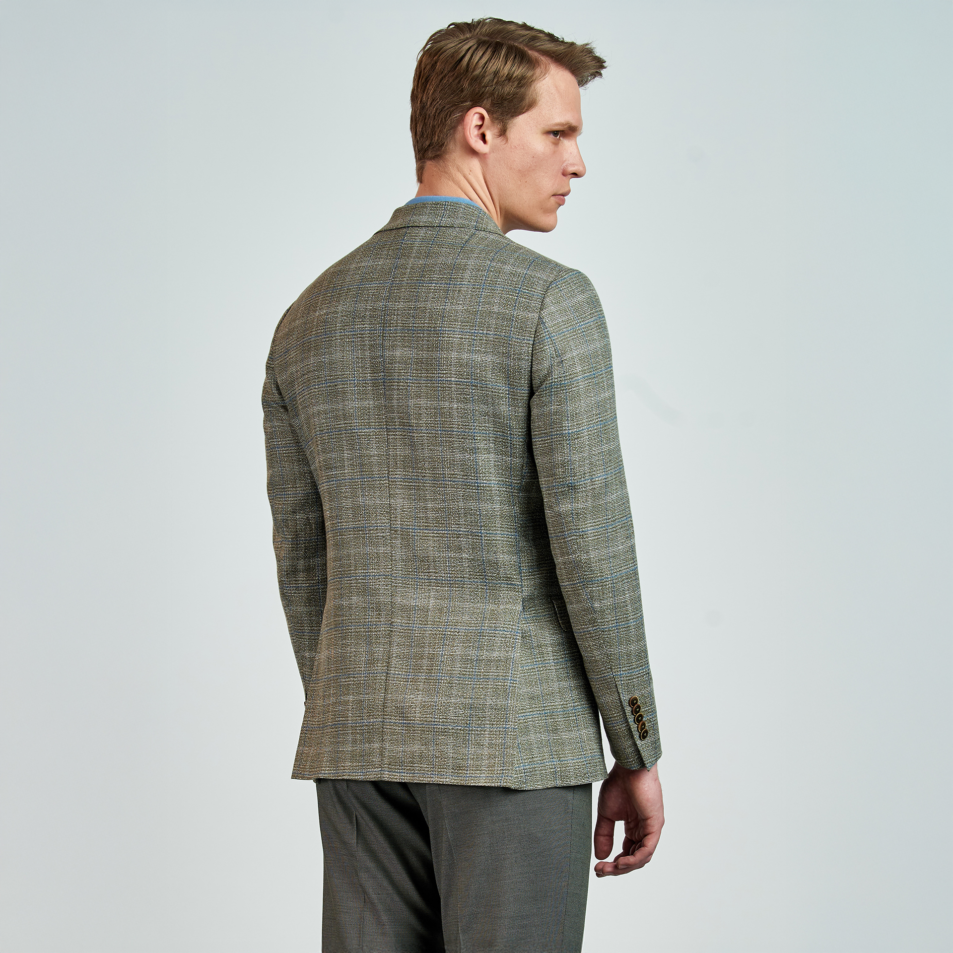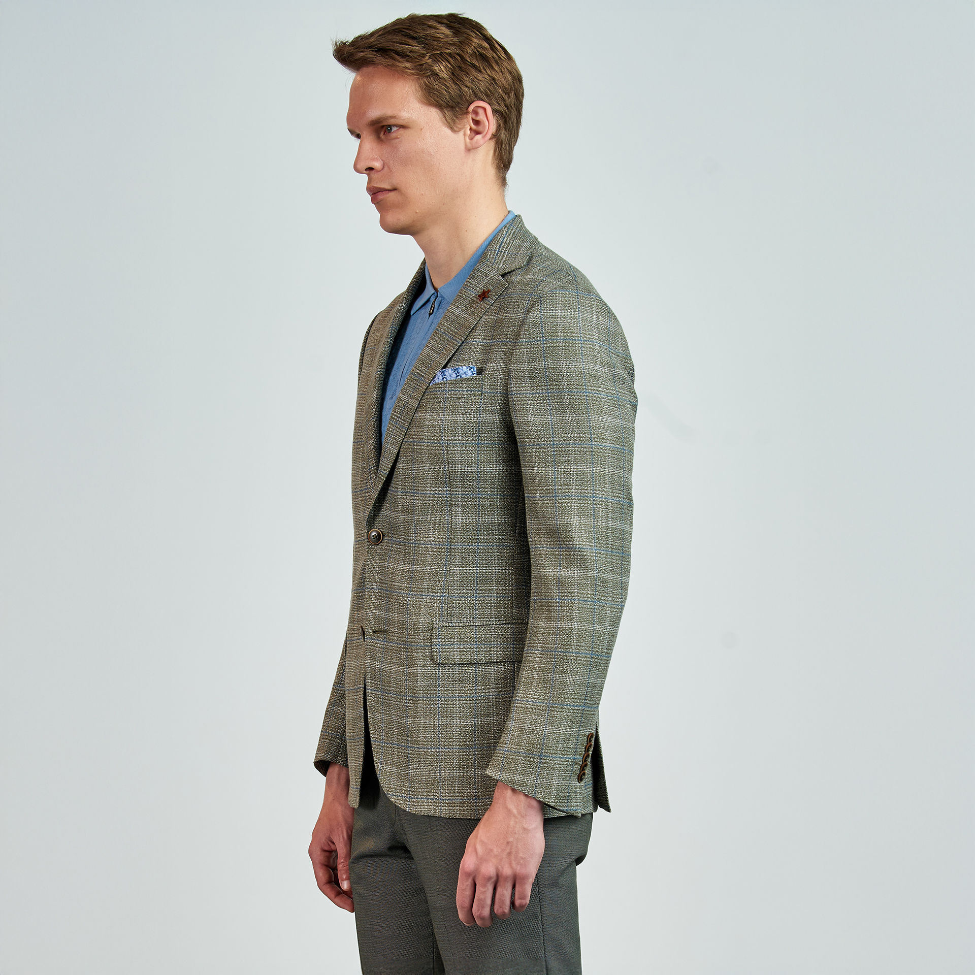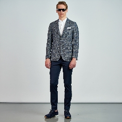 Düz renk, dokulu, kareli Ceket. Mono yaka, punto dikişli, düğme kapatmalı, çift yırtmaçlı, 3 adet dış cepli, 3 adet iç cepli.